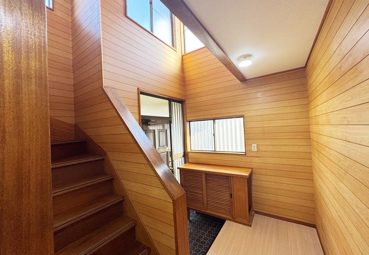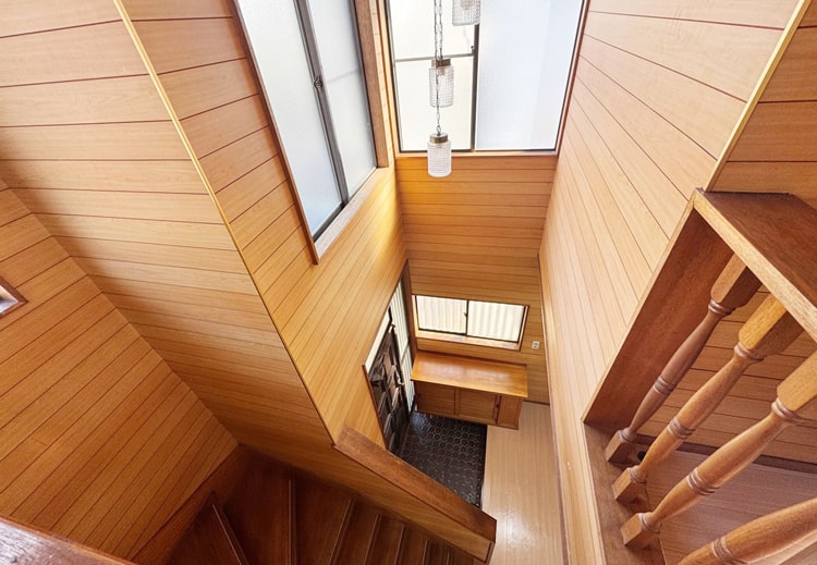 玄関を開けると吹き抜けの階段が広がり、明るく開放的な空間が迎えてくれます。