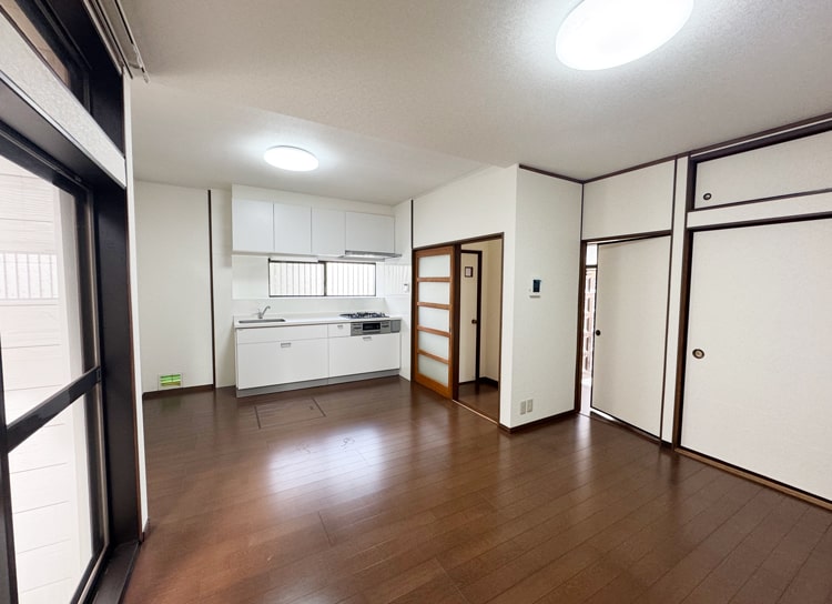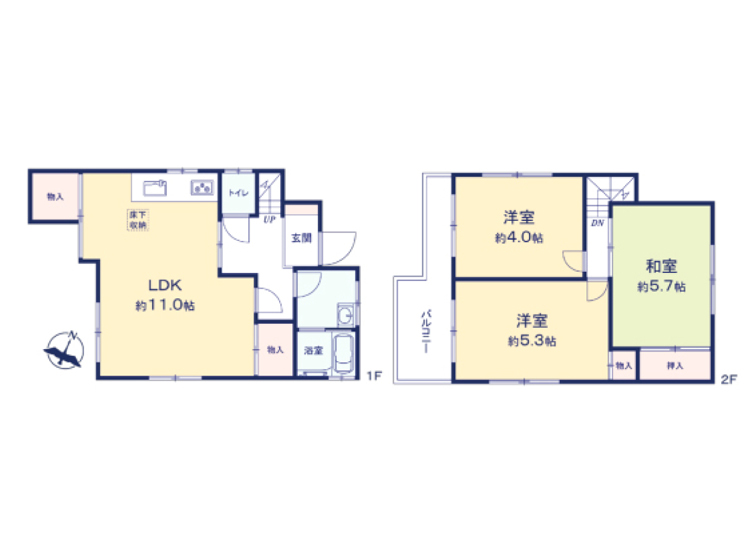 1階は11帖のLDK、2階には和室1部屋と洋室2部屋の3部屋を確保。洋室2部屋はバルコニー付きの2面採光が魅力です。